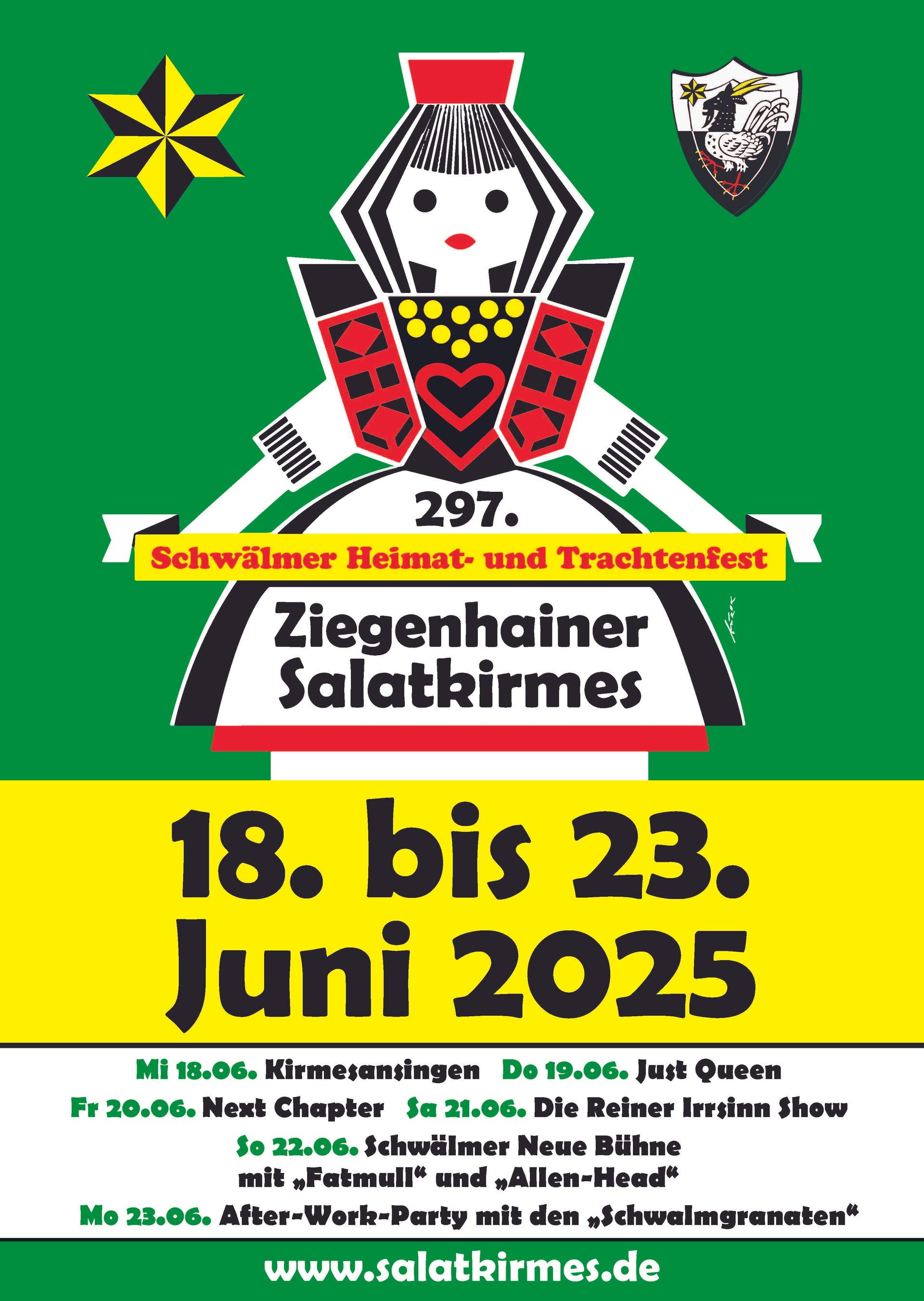 297. Ziegenhainer Salatkirmes vom 18. bis 23. Juni 2025 Die Ziegenhainer Salatkirmes geht 2025 in ihre 297. Auflage. Sechs Tage lang wird in Schwalmstadt-Ziegenhain gefeiert – mit einem vielseitigen Programm für alle Altersgruppen. Los geht es am Mittwoch, 18. Juni , mit dem traditionellen Kirmesansingen auf dem Paradeplatz. Der Bläserkorps KJV Hubertus Ziegenhain und der Projektchor aus Steina sorgen ab 19 Uhr für den musikalischen Auftakt. Offiziell eröffnet wird die Kirmes anschließend durch den Bürgermeister und den Vorsitzenden der Burschenschaft. Danach spielt die Band The Sunlights. Am Donnerstag, 19. Juni , öffnet der Festplatz ab 12 Uhr. Zeitgleich beginnt im Festzelt das Schwälmer „Lattch-Essen“. Um 15 Uhr startet das beliebte Ziegenhainer Entenrennen am Alten Schwimmbad. Ab 17 Uhr zeigt das Museum der Schwalm eine Ausstellung zum 50. Todestag des Künstlers Vincent Burek. Die Siegerehrung des Entenrennens findet gegen 18 Uhr im Festzelt statt. Den Abschluss bildet der Rockabend mit Just Queen um 21 Uhr (Eintritt 8 €). Am Freitag, 20. Juni , beginnt das Fest um 17 Uhr. Der traditionelle Marsch vom Rathaus ins Festzelt startet um 19 Uhr und bildet den Rahmen für den „Ziegenhainer Abend“ mit Vertreter:innen der Stadt, Vereinen und Gästen. Um 21 Uhr spielt die Band Next Chapter. Der Samstag, 21. Juni , beginnt ab 10 Uhr mit dem Ständchenspielen der Burschenschaft. Am Nachmittag folgen ein Kindernachmittag mit Castellos Puppentheater („Kleiner Rabe Socke“) von 14 bis 15:30 Uhr sowie ein Auftritt der Zappelfüße um 15:30 Uhr. Der Abend gehört der Liveband Irrsinn Reloaded, die ab 21 Uhr für Stimmung sorgt (Eintritt 10 €). Am Sonntag, 22. Juni , beginnt der Tag mit einem ökumenischen Gottesdienst im Festzelt ab 10 Uhr. Höhepunkt ist der große Festzug um 14 Uhr, der unter dem Motto „50 Jahre Deutsche Märchenstraße“ steht (Eintritt 4 €). Ab 19 Uhr treten FATMULL und Allen-Head auf der Bühne der „Schwälmer Neuen Bühne“ auf. Am Montag, 23. Juni , öffnet der Festplatz bereits um 11 Uhr. Um 10:30 Uhr zeigt die Freiwillige Feuerwehr Ziegenhain eine Übung am Paradeplatz. Anschließend geht es im Marsch mit Musik ins Festzelt. Dort findet das traditionelle „Lattchen“ für Neubürger:innen statt, begleitet vom Frühschoppen mit den Schwalmgranaten. Ab 18 Uhr klingt der Tag bei einer After-Work-Party aus. Parallel läuft der Familientag mit ermäßigten Preisen auf dem Rummelplatz von 11 bis 20 Uhr. Das vollständige Programm zur 297. Ziegenhainer Salatkirmes finden Sie auch unter dem Tab „ Programm “ auf dieser Website – übersichtlich nach Tagen sortiert.