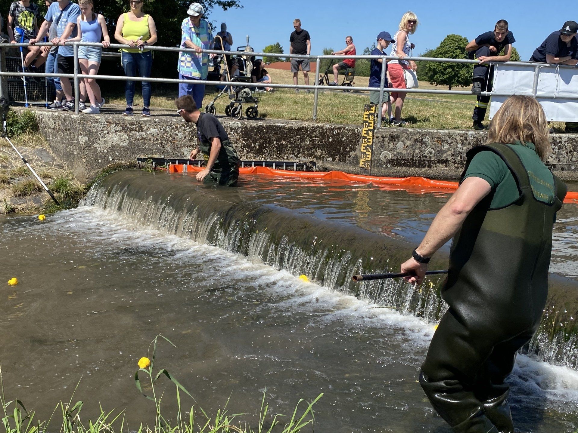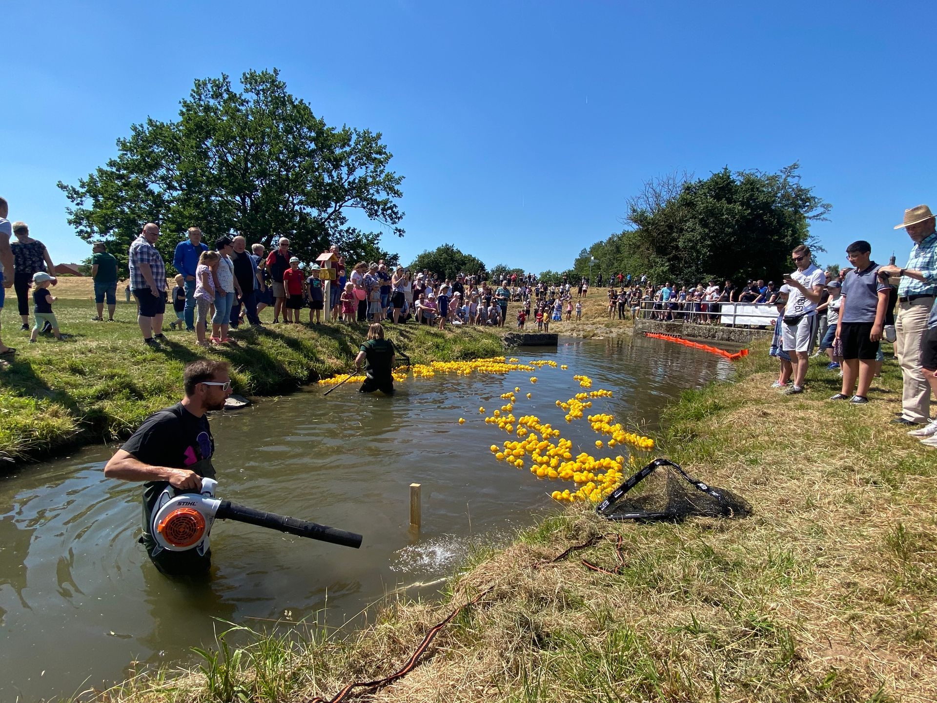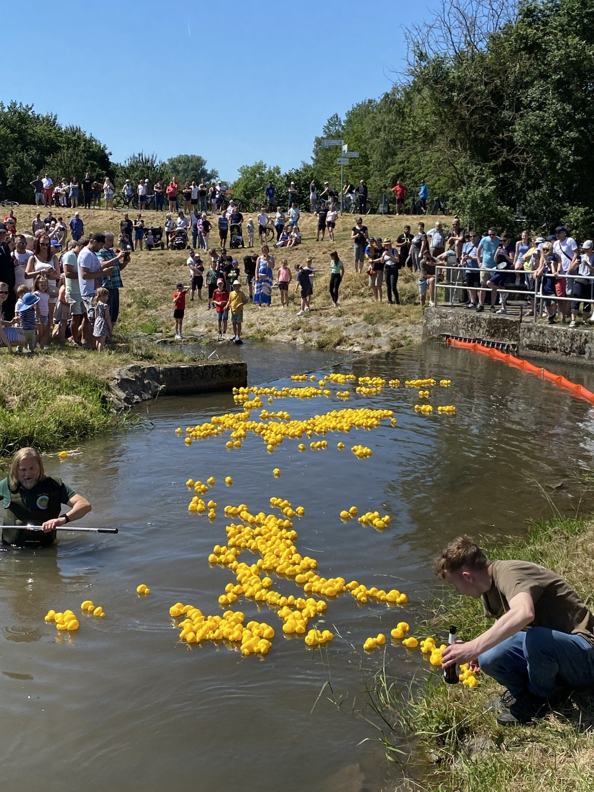 Das Entenrennen nimmt etwa eine Stunde in Anspruch, da die Strömung recht mild ist und die Enten nur wenige hundert Meter zurücklegen. Am Kirmesdonnerstag werden Mitglieder des Fischereiclubs Neptun die Enten auf dem Wasser freilassen. Um den treibenden Enten den Weg zu erleichtern, errichten Feuerwehrleute aus Treysa eine Sperre, die den einzigen Durchgang auf dem Seitenarm in Richtung Schwalm öffnet. Zwei Mitglieder des Angelvereins sind dafür zuständig, die Plastikenten voranzutreiben und sicherzustellen, dass keine von ihnen an der Uferböschung hängenbleibt.