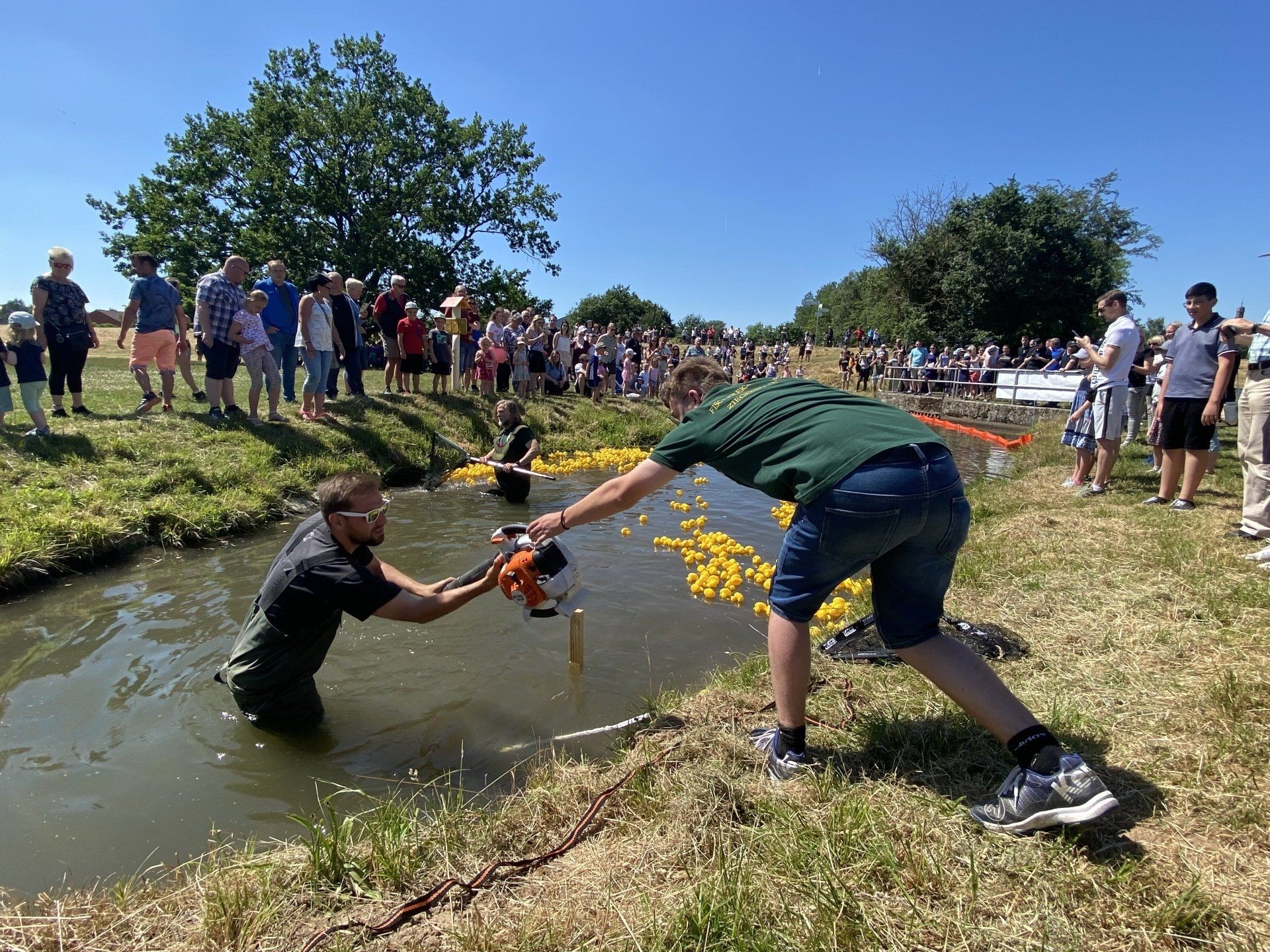 Das Entenrennen nimmt etwa eine Stunde in Anspruch, da die Strömung recht mild ist und die Enten nur wenige hundert Meter zurücklegen. Am Kirmesdonnerstag werden Mitglieder des Fischereiclubs Neptun die Enten auf dem Wasser freilassen. Um den treibenden Enten den Weg zu erleichtern, errichten Feuerwehrleute aus Treysa eine Sperre, die den einzigen Durchgang auf dem Seitenarm in Richtung Schwalm öffnet. Zwei Mitglieder des Angelvereins sind dafür zuständig, die Plastikenten voranzutreiben und sicherzustellen, dass keine von ihnen an der Uferböschung hängenbleibt.