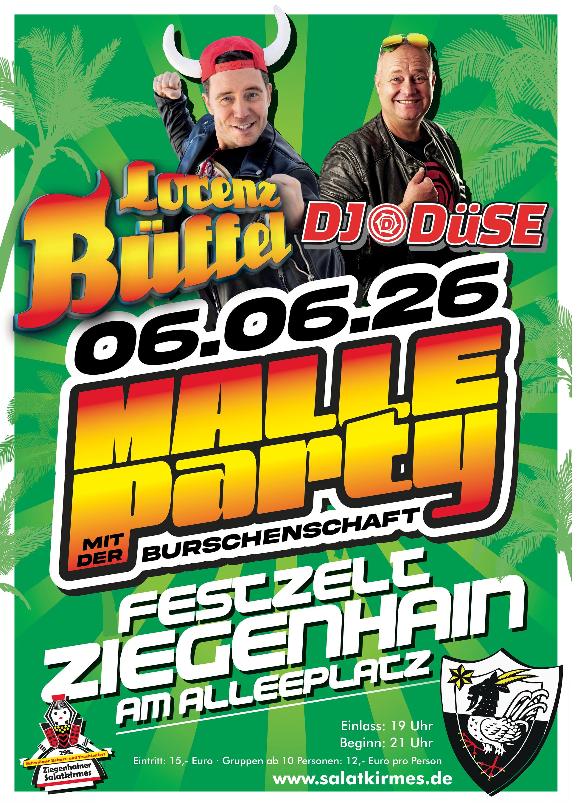 Mit Lorenz Büffel und DJ Düse stehen zwei absolute Stimmungsmacher der Partyszene auf der Bühne – und bringen das Feeling der legendären Partystrände direkt nach Ziegenhain.